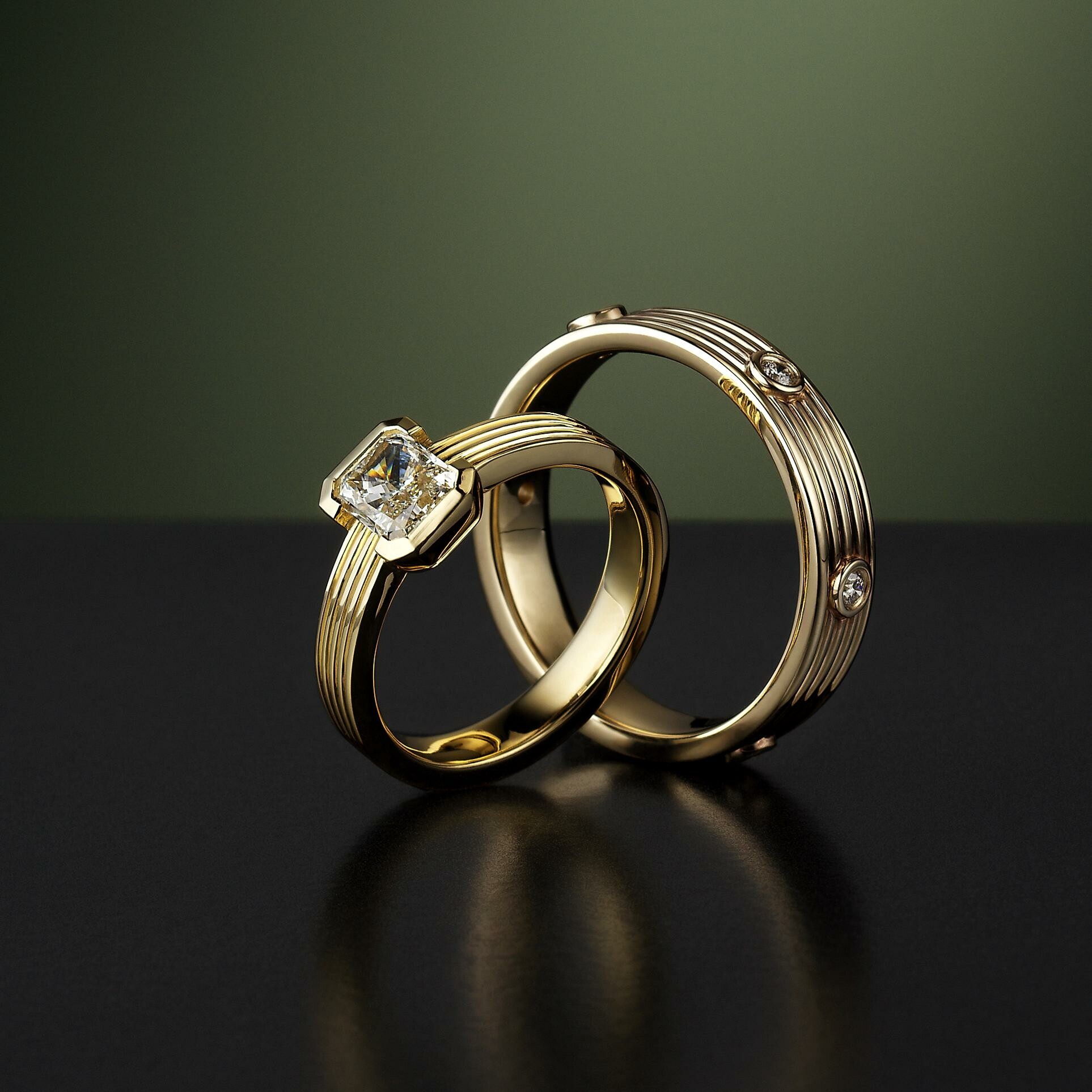 - 9K Yellow gold grooved mens wedding band, with six round brilliant cut Diamonds of total weight 0.179ct