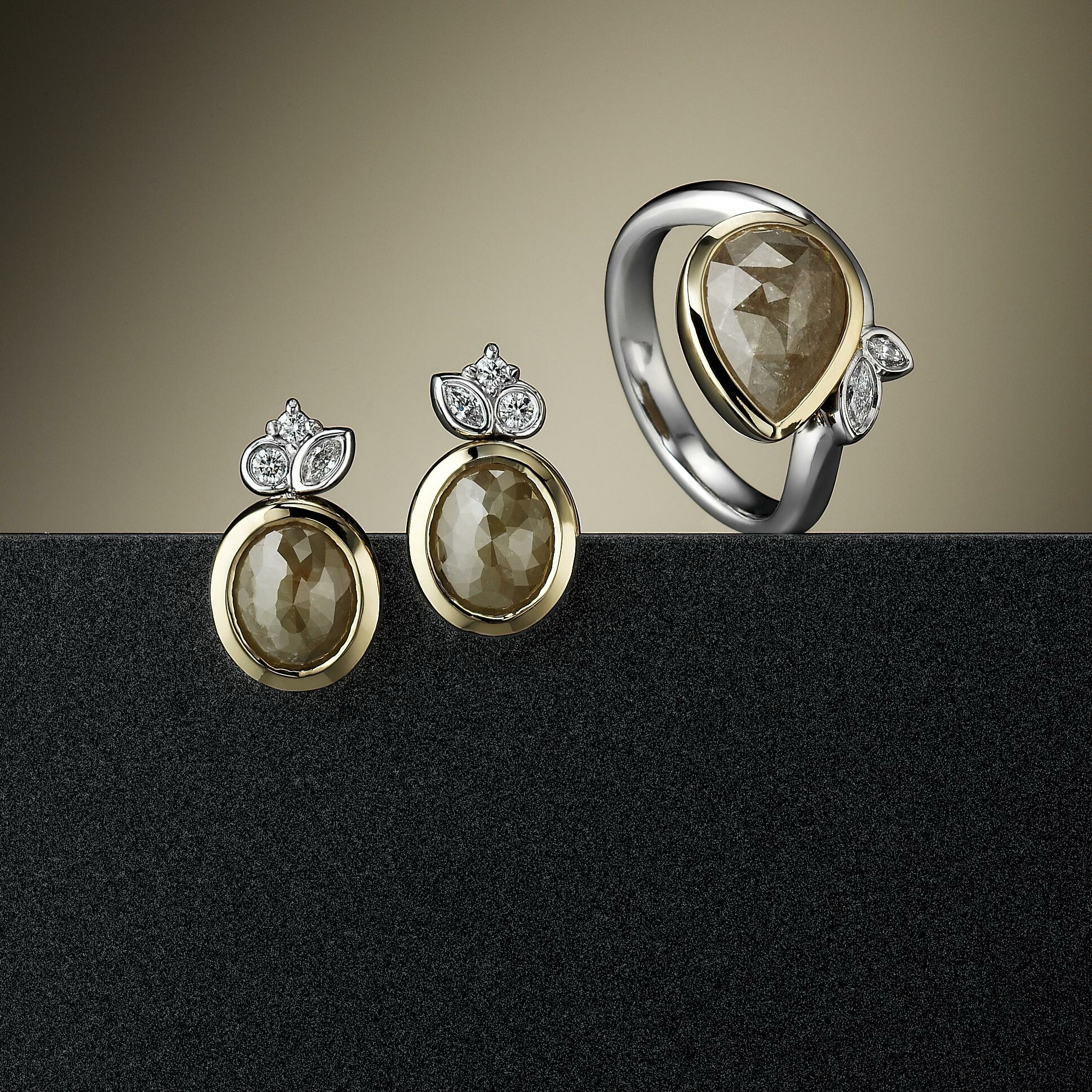 - 9K Yellow and white gold Diamond earrings, with oval shaped rustic Diamond