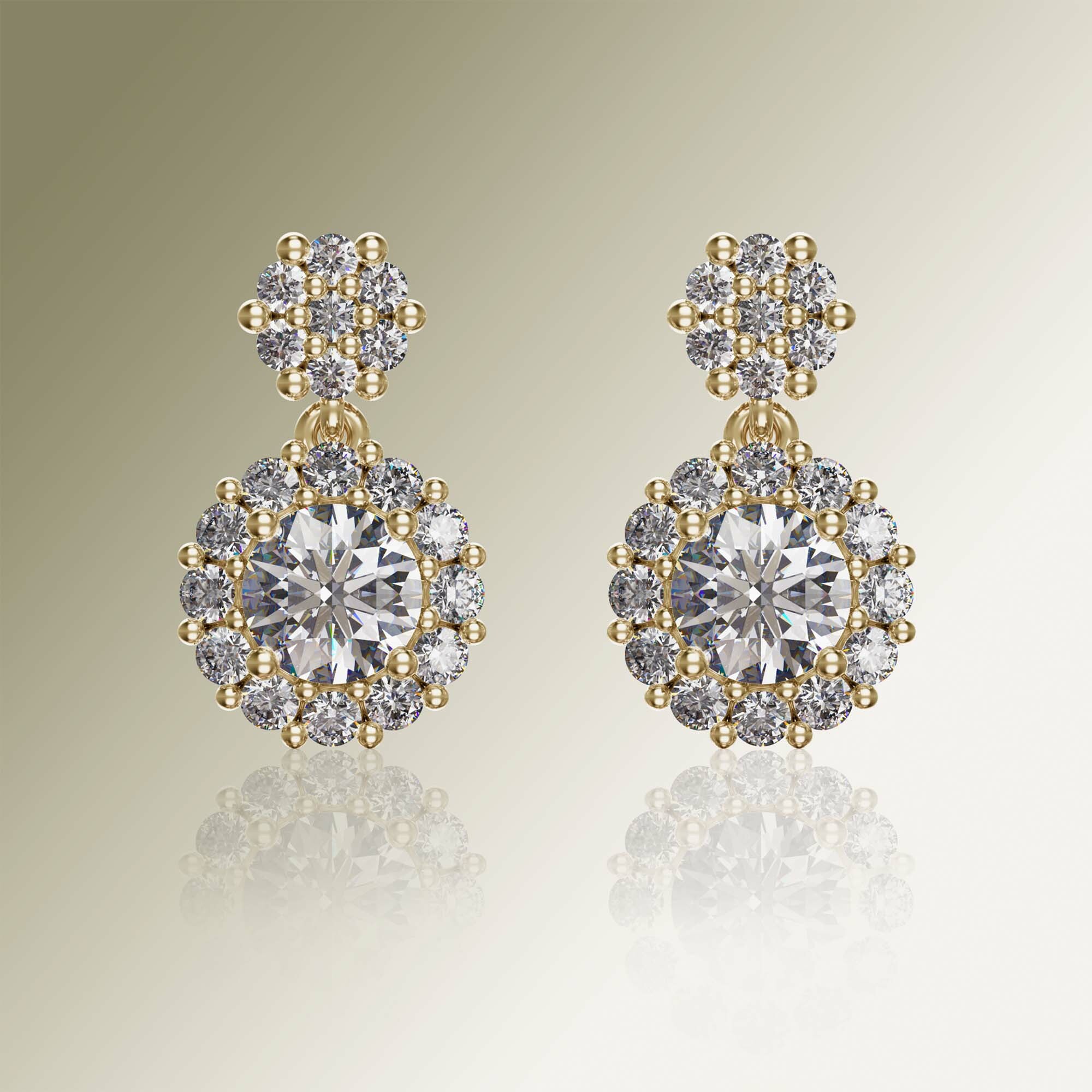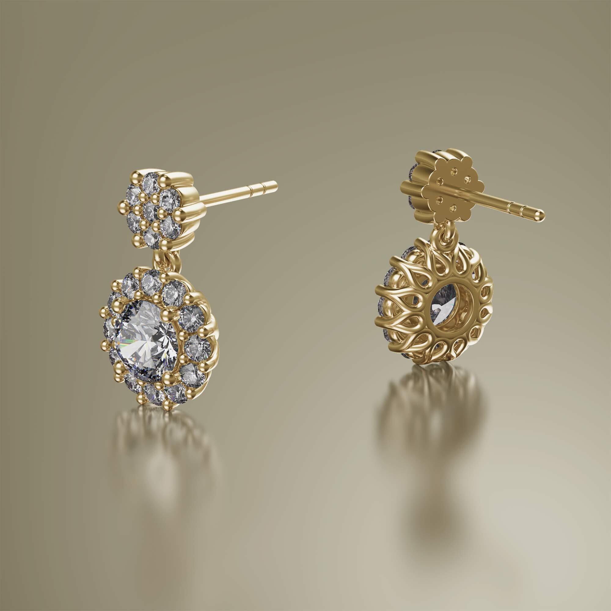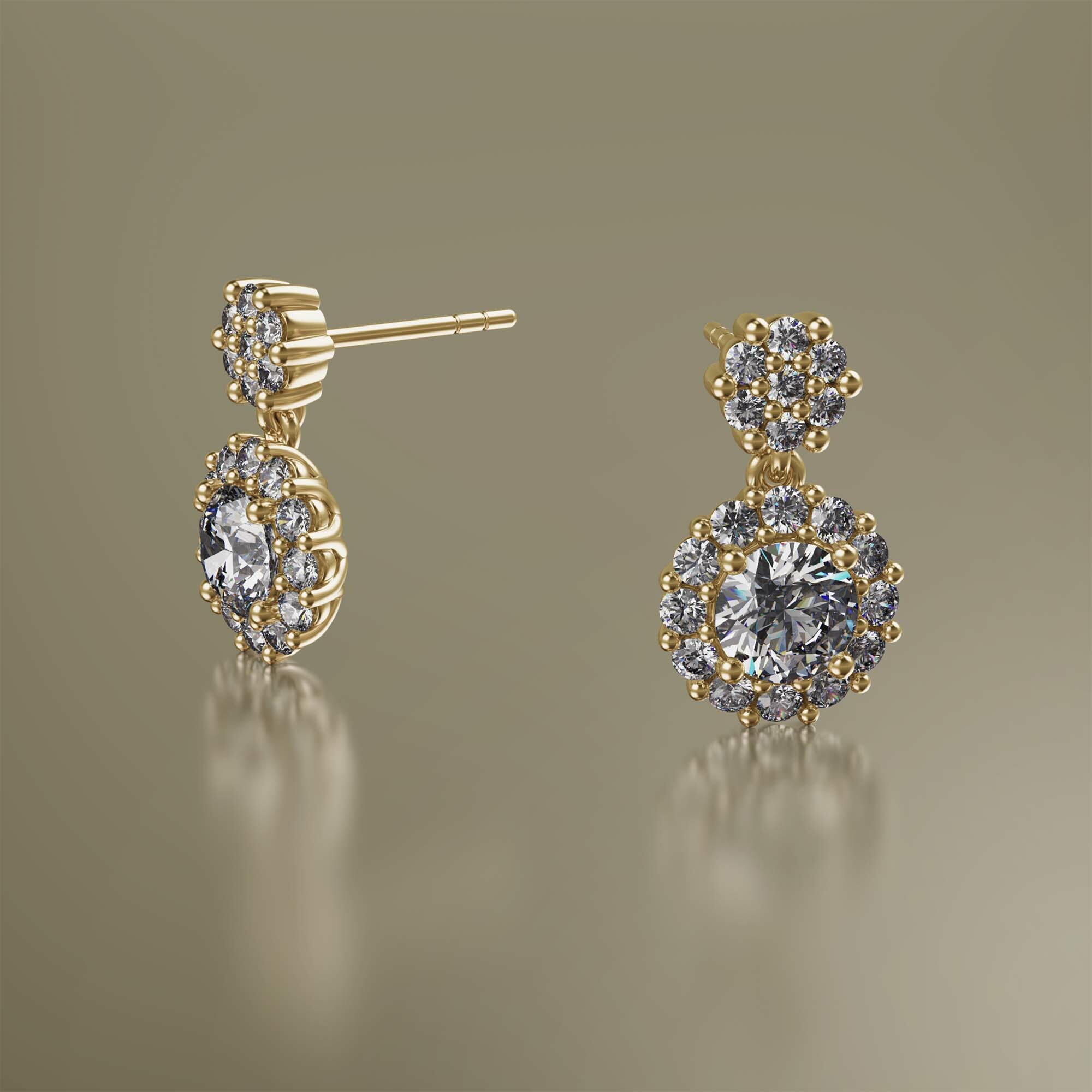 Yellow Gold Halo Round Cluster Drop Diamond Earrings